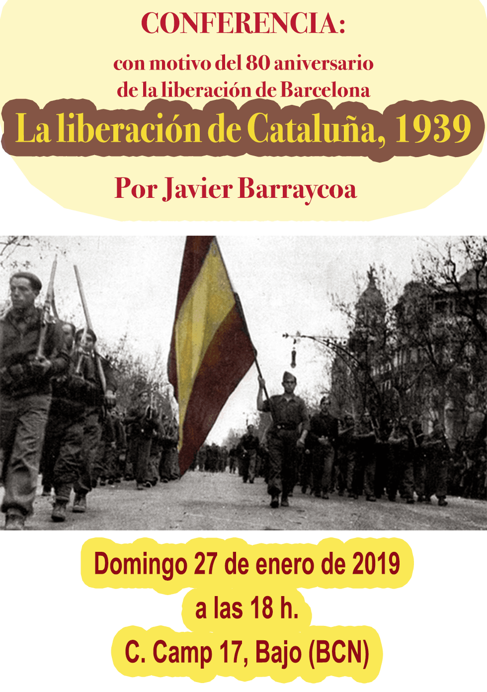 La Comunión Tradicionalista Carlista de Cataluña dará inicio al ciclo de conferencias de formación para jóvenes con la conferencia “La liberación de Cataluña, 1939” con motivo del 80 aniversario de la liberación de la capital catalana ocurrida el 26 de enero de 1939.